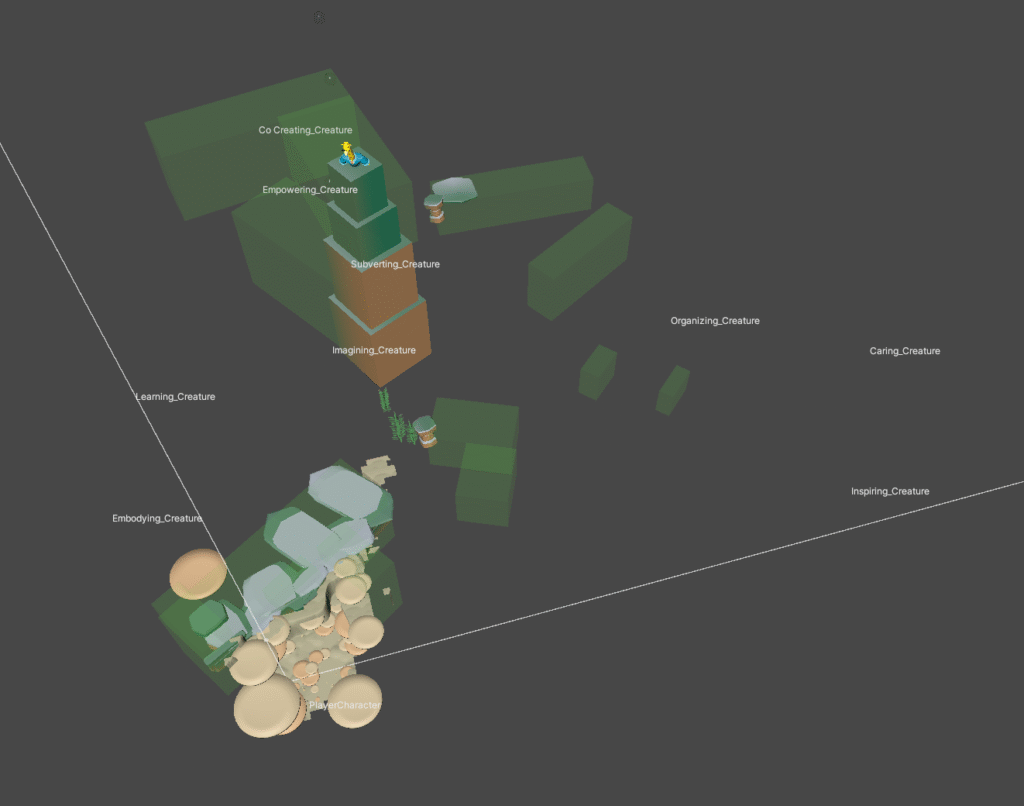 Our task was to familiarize the player with the framework, and to spark a conversation between them and the researchers behind the framework. We chose to hone in on a tool they developed for evaluating creative practices: the Nine Dimensions system. Each dimension provides a different way of looking at a creative practice and how it seeks to engage with change. The dimensions are not meant to be understood as a single indicator or target, but rather as an entire world that can be investigated and reflected on.